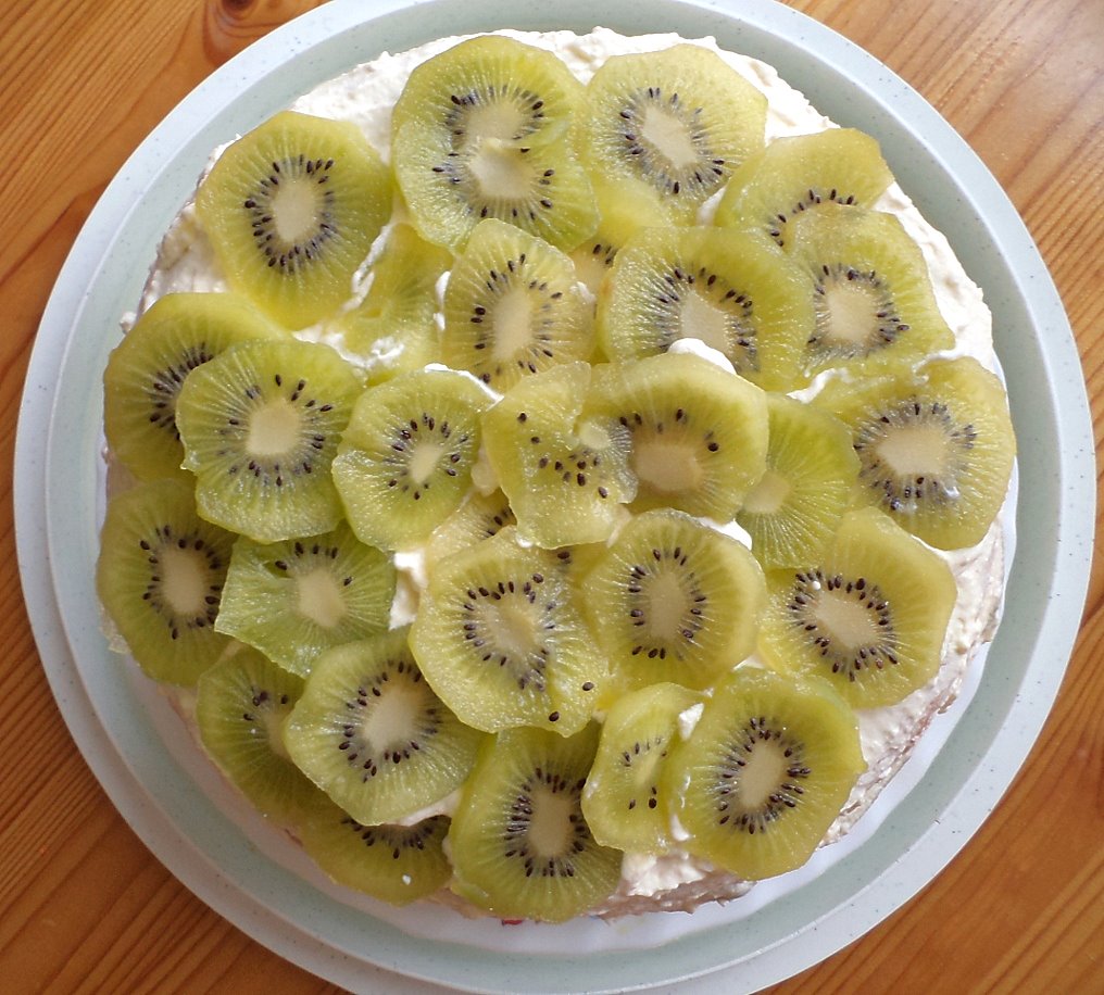 Én most úgy csináltam, hogy mivel rengeteg kivim volt, egy sor piskóta, egy sor krém, bele a kivi, egy sor krém ragasztani, majd piskótától ismétel. A teteje természetesen krémes, rá a maradék kivi, és végül 1 dl vízből készült zselé. Az oldalára LM szerint szeletelt mandulát érdemes rakni, de az most nem volt itthon, ilyen kabát lett ez...